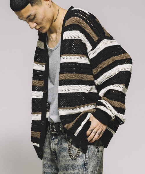 参考商品名:シアー ボーダー 透かし編み ニットカーディガン