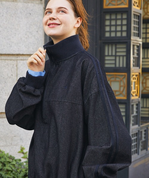 参考商品名:デニムワンポイントナンバリング刺繍 ラインハーフジッププルオーバー