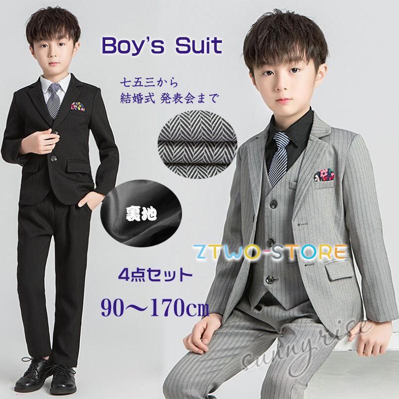 フォーマルスーツ 男の子 スーツ キッズ 子供服 4点セット 上下セット セットアップ タキシード ストライプ 黒 ジュニア 入学式 卒業式 七五三 結婚式 発表会 110cm 120cm 130cm 140cm 150cm 160cm 170cm