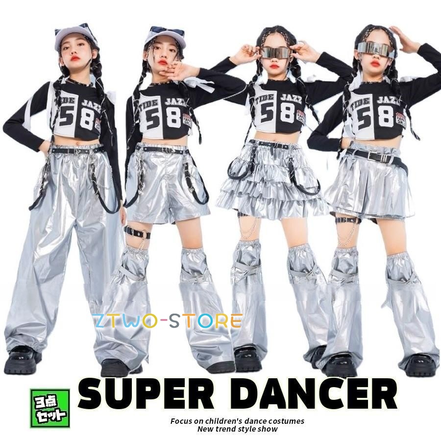 ダンス衣装 キッズ セットアップ 派手 バイカラートップス メタルパンツ スカート K-POP 韓国 ガールズ ダンスウェア ダンス衣装 白黒 シルバー
