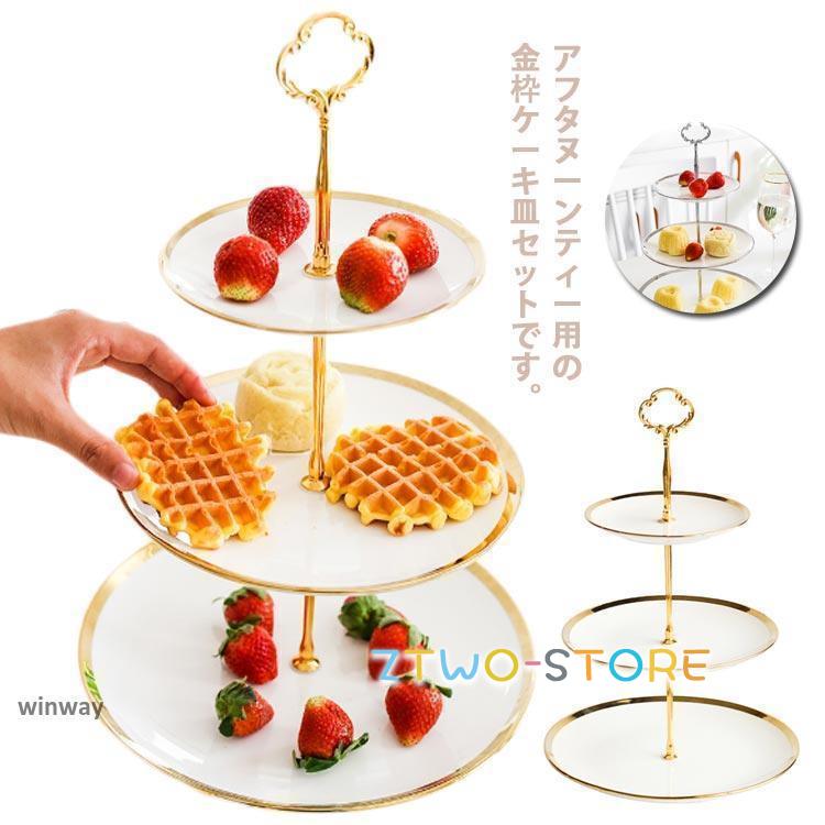 ケーキスタンド ティースタンド 3段 アフタヌーンティー ゴージャスな金枠プレート フルーツ トレー 陶磁器 果物皿 セット お菓子のトレイ 三段 ヨ