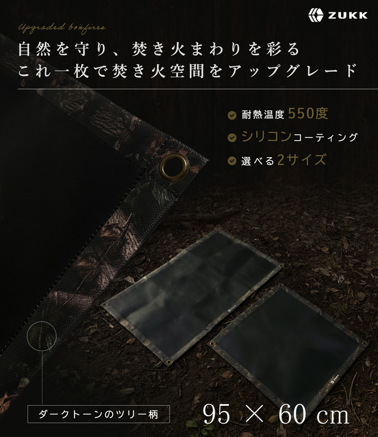 ZUKK ズック 公式 焚き火シート 長方形 95x60 黒 スパッタシート 焚き火台シート ツリー柄 大判 焚き火台 キャンプ 耐火 耐熱 防炎 防火 ガラス繊維