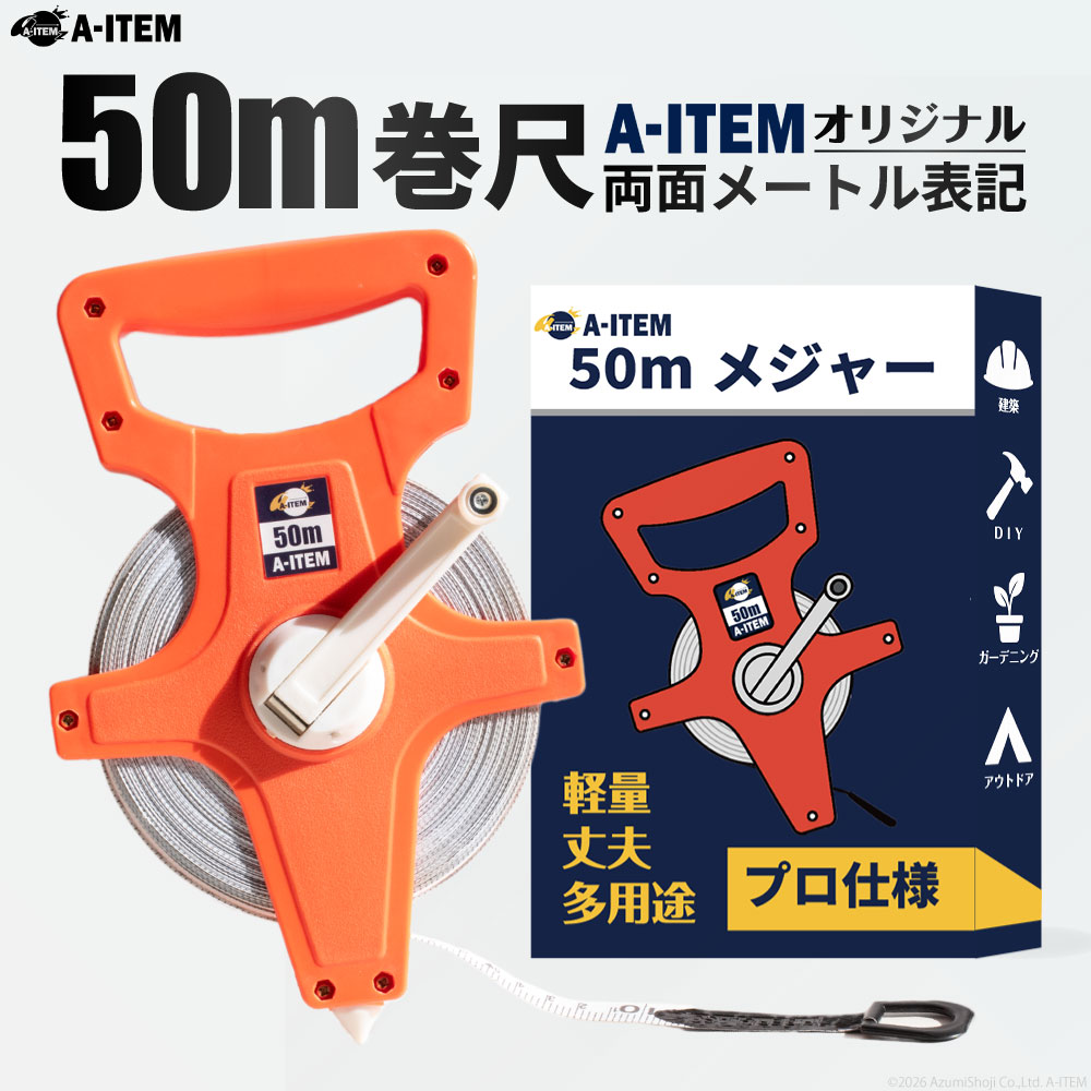 【50mロング巻尺】建築・測量・外構・DIYなど、広い距離の測定に対応する50mタイプ。屋外作業や現場測定に適しています。