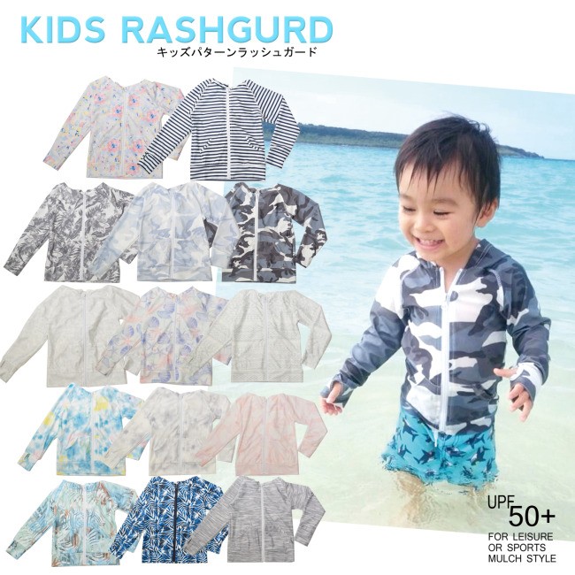 【こちらはキッズ用となります】 年中、何かと重宝するラッシュガード。パーカータイプなので水着の上から羽織ったりアウトドアに着て行ったりと、気兼ねなく使えます。