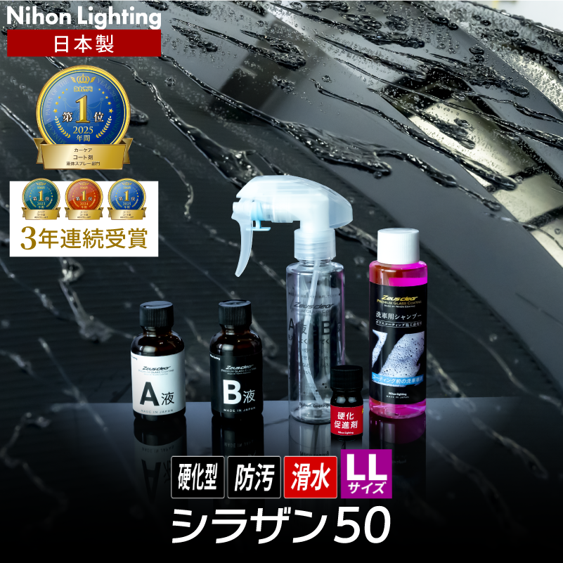 【スプレー式ガラスコーティング】ゼウスクリア シラザン50 [LLサイズ] 70ml 耐久3年以上 超撥水 超滑水 ボディ ガラス ホイール マフラーなど